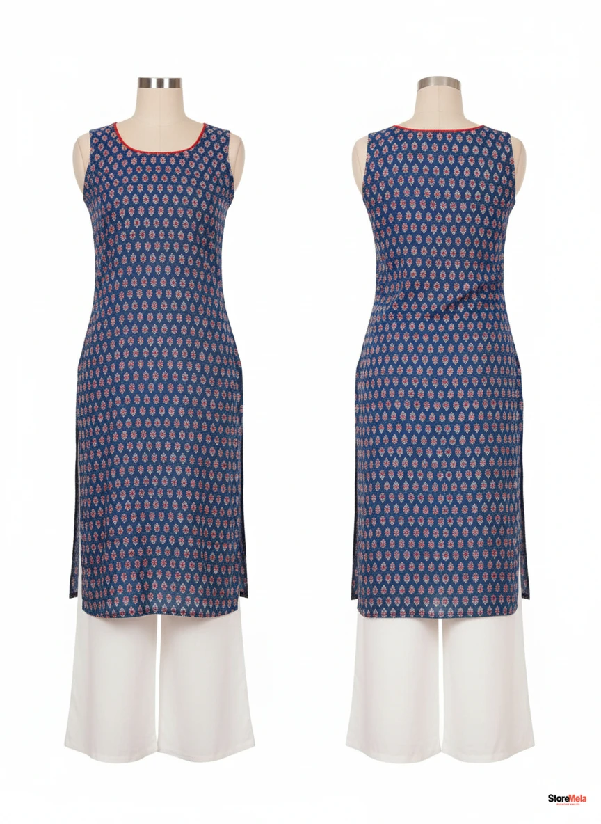 Designed with elegant blue booti print and stylish pom-pom lace detailing, this kurti delivers a beautiful and trendy ethnic look. The sleeveless design makes it perfect for summer wear, daily use, office styling, and casual outings.