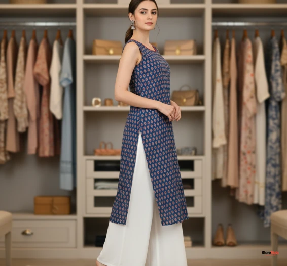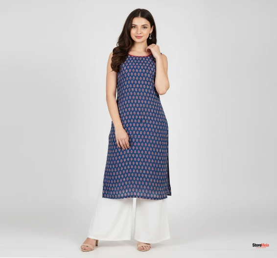 Add effortless charm to your ethnic wardrobe with the Storemela Shikha Blue Booti Printed Sleeveless Kurti. Crafted from soft and breathable rayon fabric, this straight-fit kurti offers superior comfort and a graceful fall.