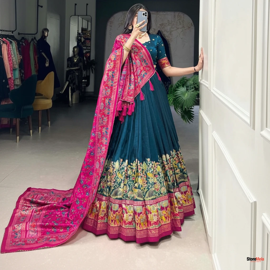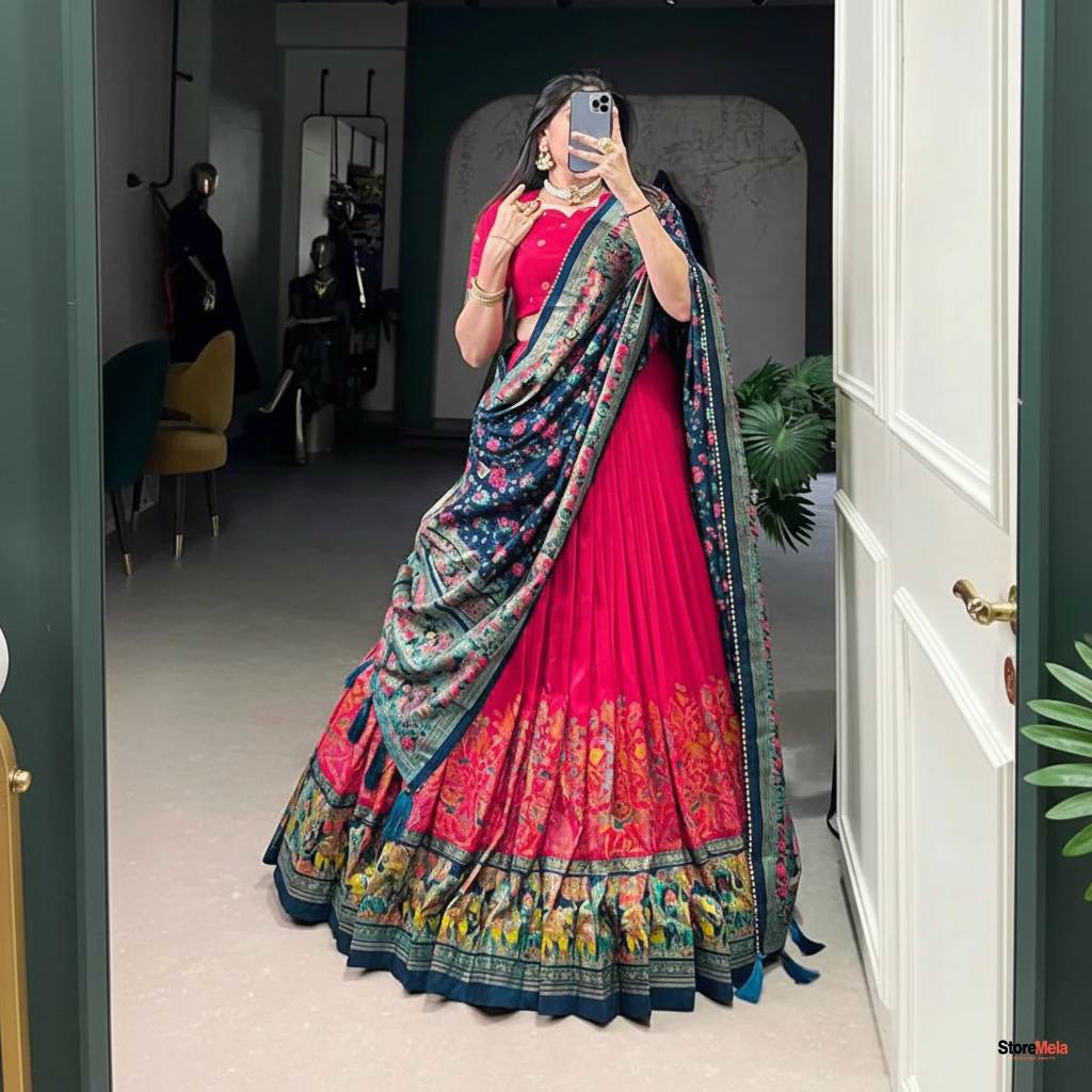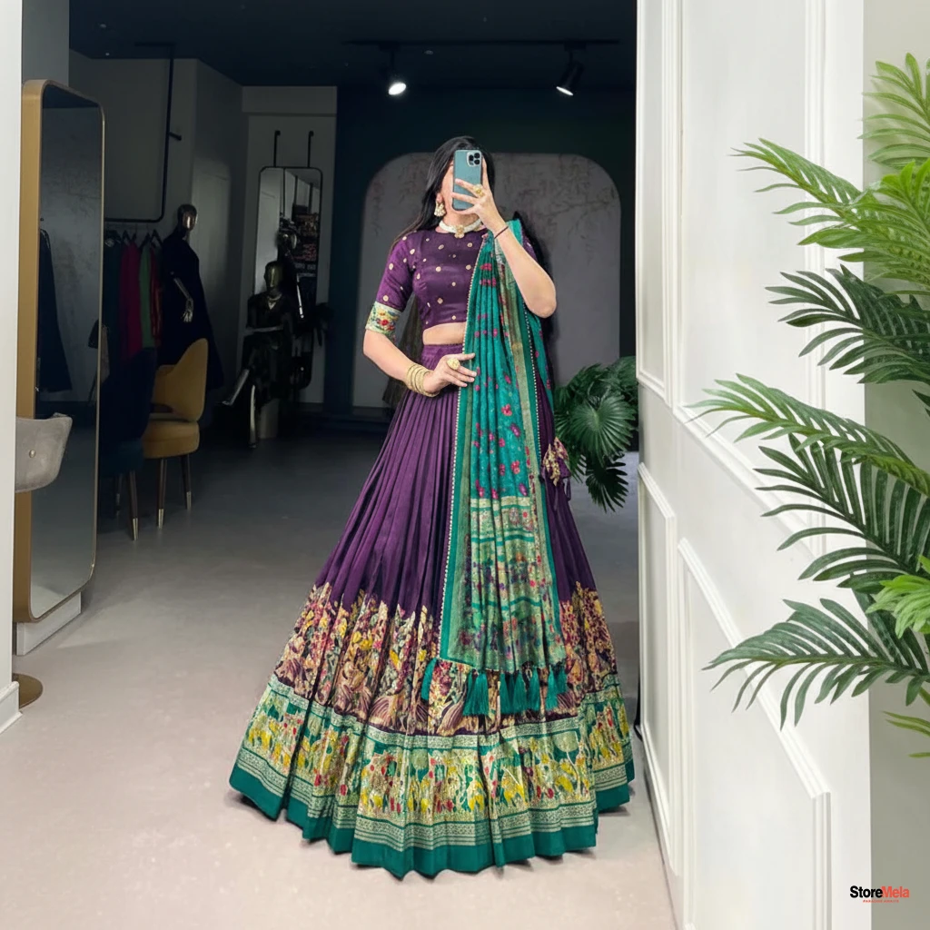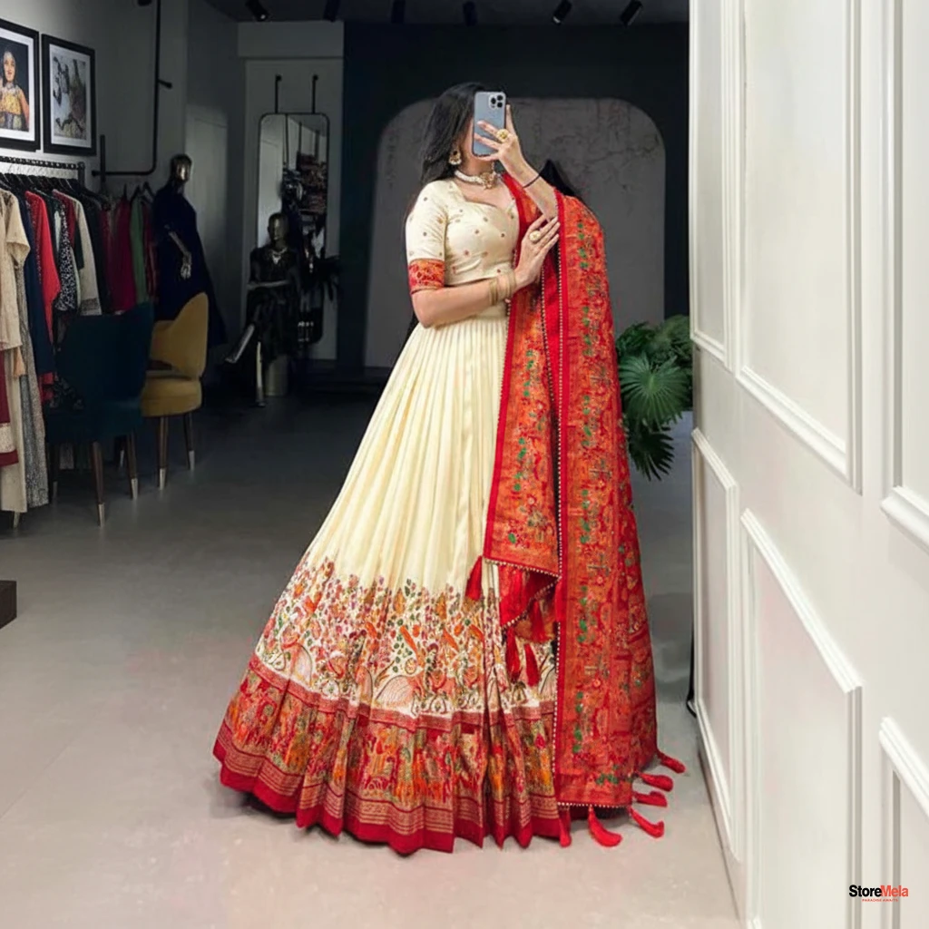 Make a graceful statement with the Storemela Women’s Tussar Silk Lehenga Choli Set, designed to reflect elegance and tradition. Crafted from premium Tussar silk fabric, this semi-stitched ethnic set features a stunning white floral & Patola print with foil work detailing that enhances its festive appeal.